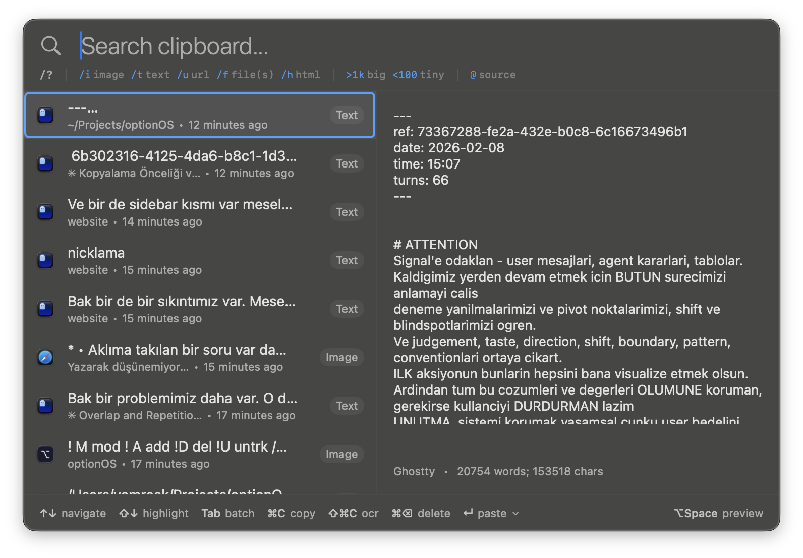 Tüm kopyaladıkların tek yerde — kaynak, tür, zaman bilgisiyle