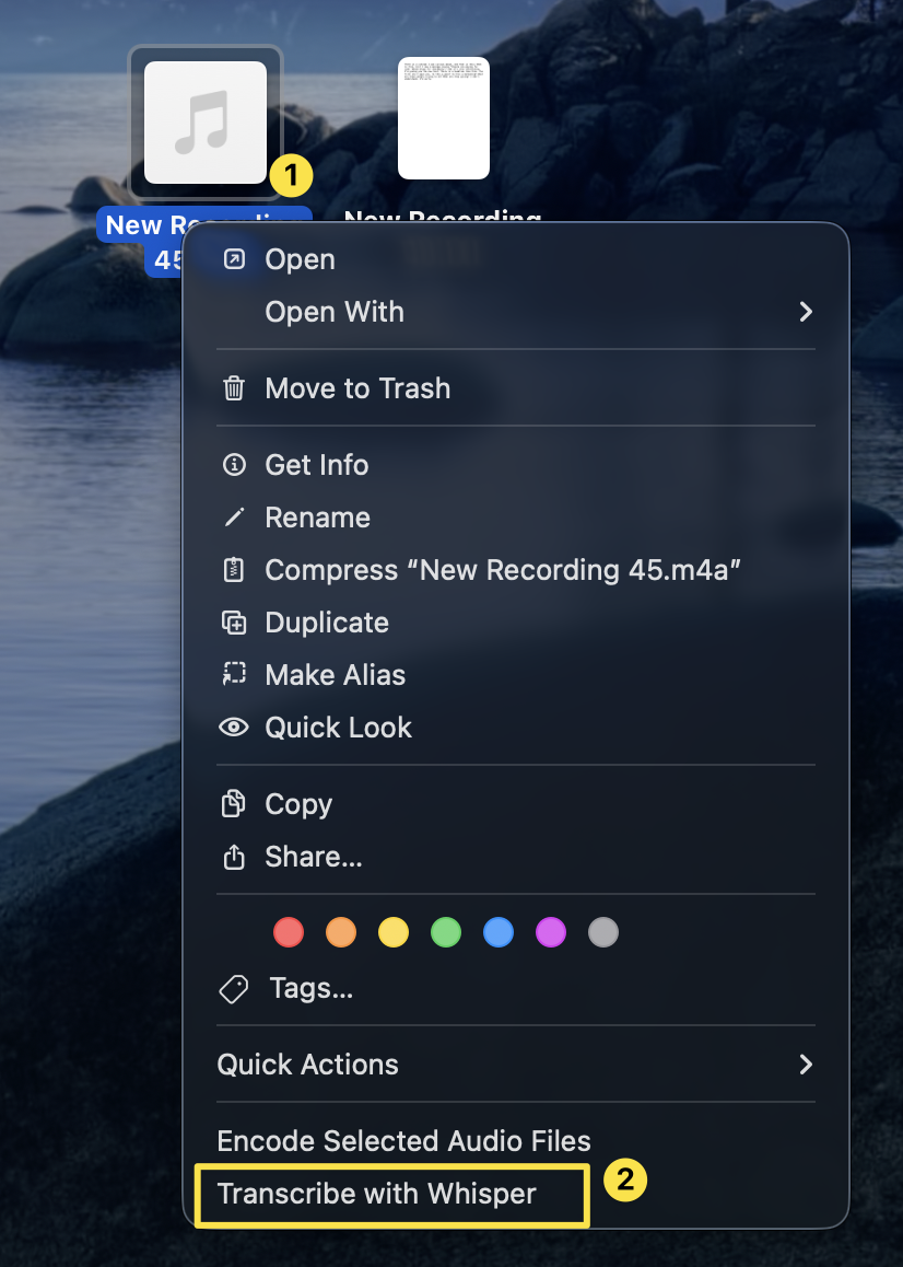 Right-click the file in Finder → Transcribe with Whisper.