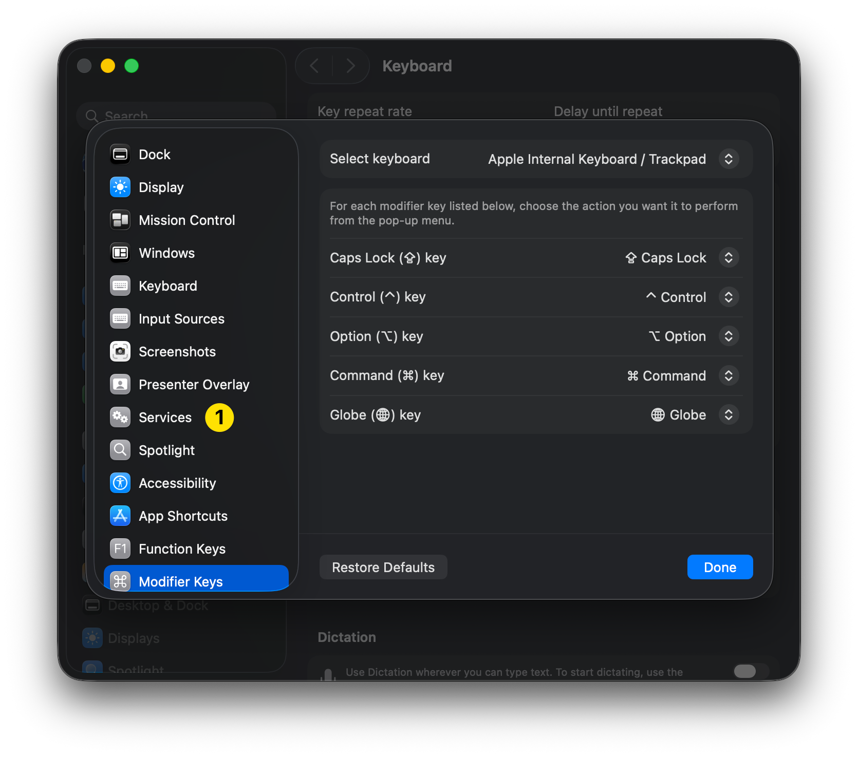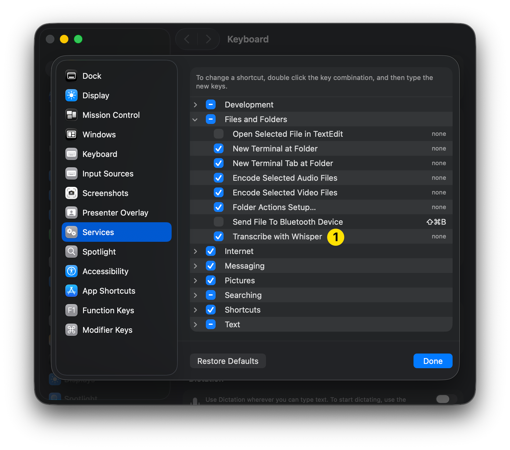 Keyboard Shortcuts → Services